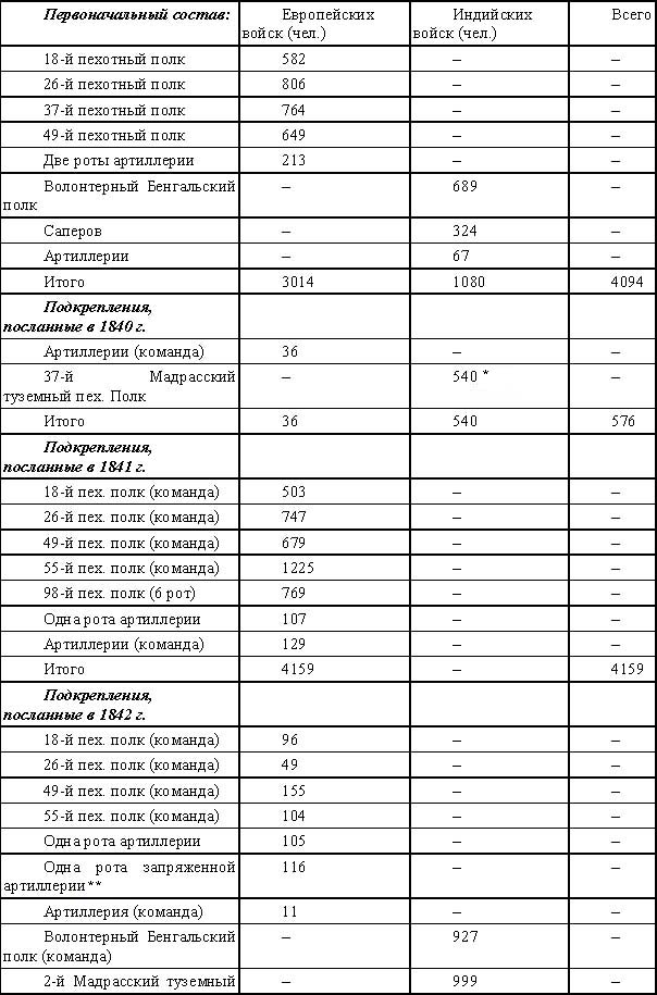 Из индийских войск участвовали одни волонтеры, а именно: из армии Бенгальского президентства был образован: