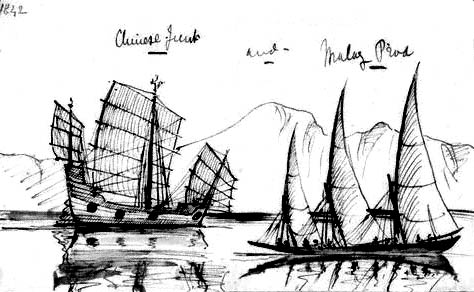Китайская джонка и малайская лодка проа. Рис. У. Уордропа (сер. XIX в.)