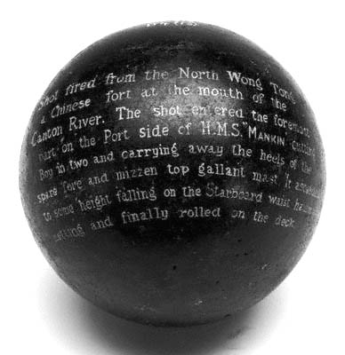 Китайское ядро с английской канонерской лодки «Мэнкин», участвовавшейв операциях в устье Жемчужной реки 22–24 октября 1856 г. На ядре нанесена надпись, которая свидетельствует, что оно было выпущено с одного из фортов, расположенных на северной стороне устья и, влетев с носовой части левого борта, убило юнгу, служившего на этом судне.