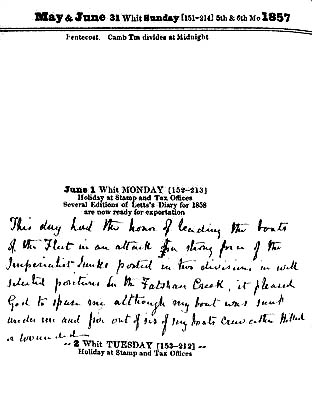 Страничка из ежедневника коммодора Кеппела. На ней оставлена краткая запись об атаке на китайскую флотилию 1 июня 1857 г. в бухте Фатшан (одна из операций в дельте Жемчужной реки, не привлекшая к себе внимания авторов данной книги): «В этот день моя шлюпка имела честь быть одним из буксиров королевского Флота, атаковавшего большие силы императорских джонок, расположенных двумя группами на хорошо выбранных позициях в бухте Фатшан; благодарю Бога за то, что он хранил меня, хотя моя шлюпка была потоплена и пять человек из ее экипажа оказались убиты или ранены».