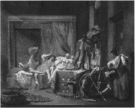 В спальне стоит только что застеленная кровать. Ночь уже вступила в свои права. Из ресторана доносятся голоса, шум, звон бокалов. За столом сидят женщины, они обнимаются. Мужчины, отупев от усталости и вина, глядят недовольным взглядом гурманов на эти женские шалости. Среди них есть человек, который уже решил остаться здесь до утра. Он тоже ждет. Он думает о том миге, когда окажется в объятиях вот этой женщины, к ногам которой он очертя голову бросил все — свое состояние, свою честь, свое доброе имя. Ему это нравится. Ему нравится, что о нем говорят в свете — в салонах, на скачках, за картами; ему нравится, что все знают: он потратил все, что накопил за свою жизнь, на любовь одной красавицы, расположения которой так хотели бы добиться его друзья.