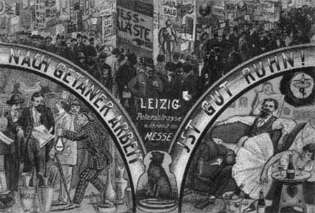 Лейпциг: дни ярмарки (на работе и ночью с красоткой). Почтовая открытка. Начало XX в.