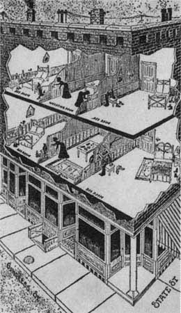 Большой дом, красный фонарь, занавешенные окна, в которых горит свет. Улица, ночь в квартале, пользующемся дурной славой. По улице идет человек, он останавливается, затем снова ускоряет шаг. Его берет за руку зазывала. Из дома доносятся звуки веселья, музыка, чувствуется запах спиртного. У человека идет кругом голова, зазывала открывает ему дверь. В фойе клиента встречает младшая бандерша. Назад дороги нет — человека проглотила фантастическая машина сексуального удовольствия, работающая в этом борделе на полных оборотах. Поздно ночью или рано утром он выйдет оттуда — оглушенный, уставший, разочарованный или довольный. Как может мужчина в XIX веке пройти мимо борделя, когда они повсюду? Любовь можно купить везде — от роскошных домов в районе Пале-Рояль до вшивых меблированных комнат улицы Монжоль, от шикарных борделей Шато-Гонтье до матросских баров в Марселе и кафе (на втором этаже всегда есть комнаты, а в зале, увешанном непристойными картинами, разносят пунш полуодетые официантки). Везде можно найти бордель, от него никуда не деться — ведь сама полиция разрешает его держать; вся его деятельность находится под контролем властей. Бордель — уголек, от которого то и дело сгорает в пожаре страсти весь город; бордель регулирует отношения многих городских жителей; бордель — достопримечательность, место общения; его посещают все — женатые мужчины, солдаты, юноши, холостяки, стар и млад.