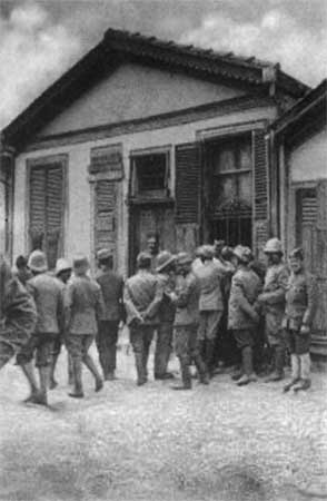 Клиенты выстраиваются в очередь у входа в публичный дом. Греция. Салоники. Почтовая открытка. Начало XX в.