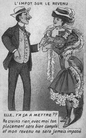 Подоходный налог. "Вкладывайте ваши деньги, — говорит проститутка сутенеру, — и не беспокойтесь: мои доходы налогом не облагаются". Франция. Почтовая открытка. Начало XX в.