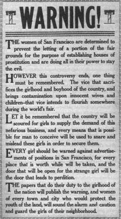 Воззвание женщин Сан-Франциско по поводу угрозы роста проституции из-за проведения Панамо-Тихоокеанской международной выставки. США. 1915 г.