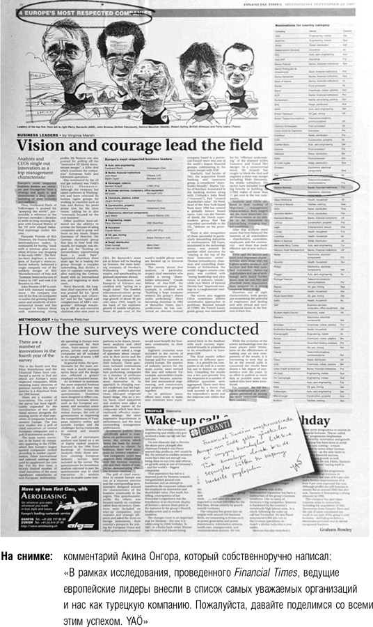 Мне кажется, стоит привести несколько конкретных примеров, чтобы точнее описать Акина как блестящего лидера. По моему мнению, главная особенность его руководства – открытость и способность выдержать любую критику. Такое нечасто встретишь в деловой культуре Турции, да и в большинстве других развивающихся стран. Еще одна особенность Онгора – стремление к инвестициям в кадры, лучшим доказательством которого служит факт, что абсолютно каждый сотрудник банка прошел полагающийся ему образовательный курс. За банком Garanti закрепилась слава «лучшего работодателя» среди всех турецких банков.
