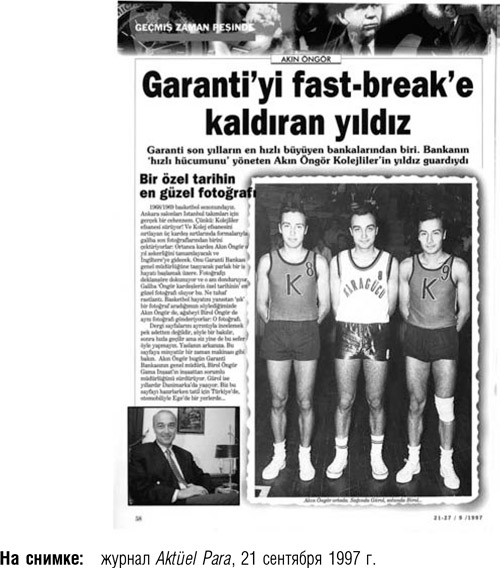 Успех Акина Онгора в банковском деле обусловлен его успехами в баскетболе, ведь в свое время он играл в составе сборной Турции. После ухода из спорта ему довелось поработать в различных международных компаниях, и венцом его карьеры стала должность президента банка Garanti с 1991 по 2000 г. Вот что однажды сказал мне Онгор: «Спорт крайне важен для развития сообразительности, создания правильной мотивации; он вырабатывает умение принимать важные решения. Баскетбол учит командной игре».