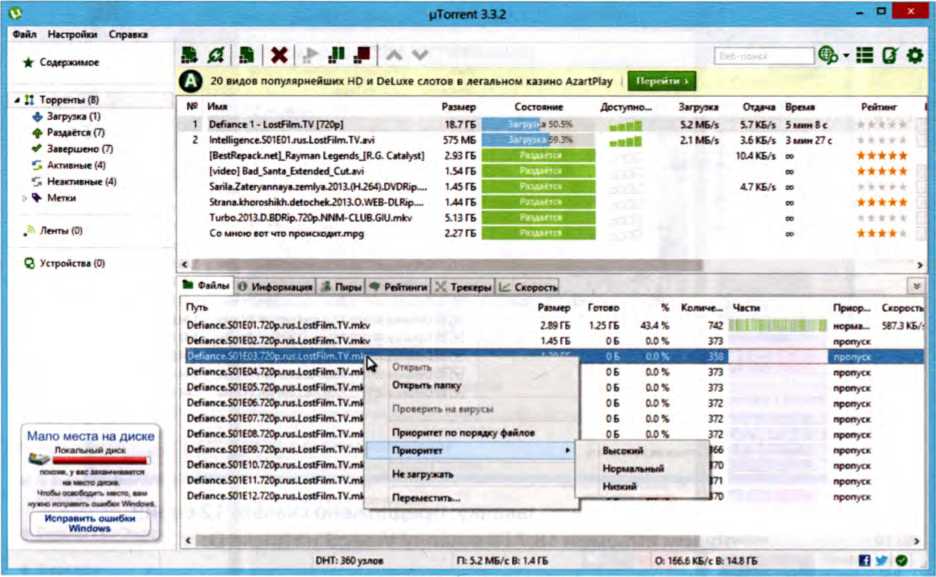 В принципе, можно влезть в настройки pTorrent (меню Настройки ► команда Настройки программы) и на странице Скорость задать ограничение для скорости приема данных (введя число килобайтов в секунду) - такое, чтобы скачивание не мешало другим операциям в интернете. Если будет такое желание, поэкспериментируете с этой настройкой.