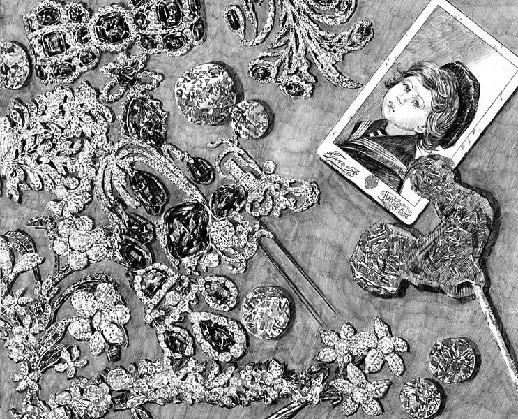 Я подумал, что нужно будет подобрать рассыпавшиеся драгоценности: диадему-бандо, бриллиантовый аграф, бант-склаваж, малый букет, эгрет-фонтан.