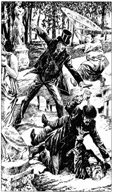 Он уронил свой маленький револьвер, схватился за зыбкие перила и застыл на месте, откинув назад голову. Мелькнуло белое лицо, перечеркнутое полоской усов, и исчезло, завешенное черным крепом.