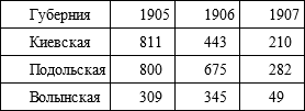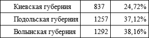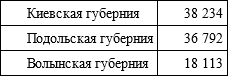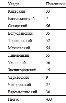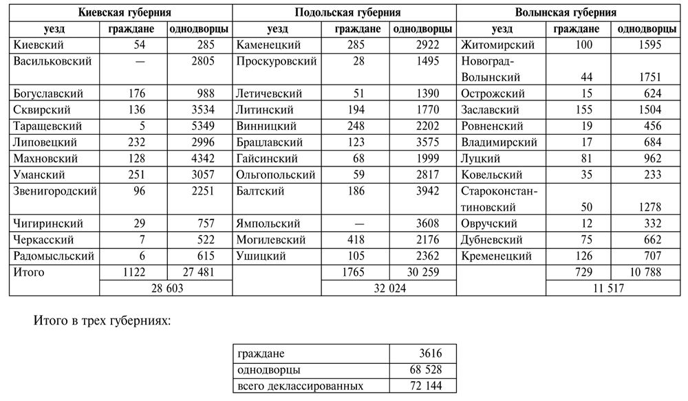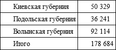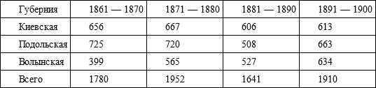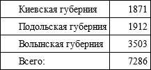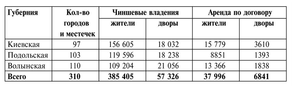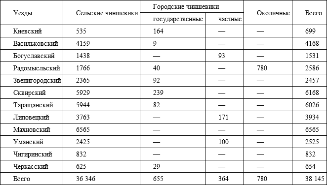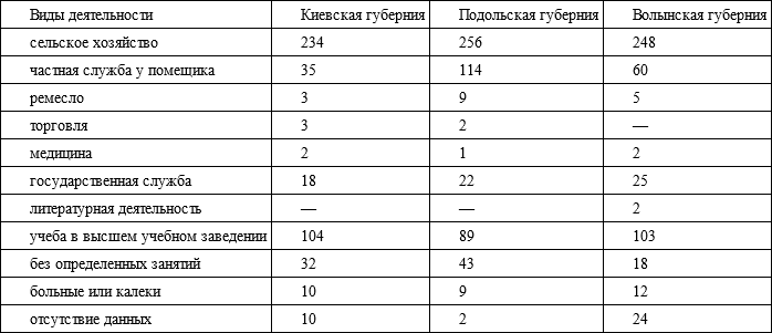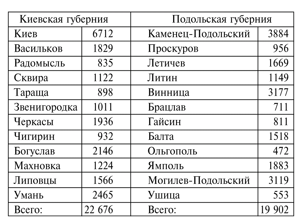 Путешественника из Западной Европы в то время удивляло почти полное отсутствие следов урбанизации на изучаемых нами землях. После присоединения к России, Правобережная Украина была разделена на три губернии по двенадцать уездов в каждой. Уездные органы власти расположились в местечках, называемых с этого момента городами, в большинстве своем заслуживающими именоваться в западном смысле слова того времени – всего лишь селами. Благодаря расположению в них полицейской управы, суда и почтовой конторы, проведению время от времени шумных и людных ярмарок, эти городки постепенно начинали развиваться. Однако ни один из них не пережил расцвета, подобного тому, который пришелся на долю Киева во второй половине XIX в. Свидетельством тому являются данные по «городским» жителям Киевской губернии за 1806 г. и Подольской за 1813 г. (охватывают только мужское население):