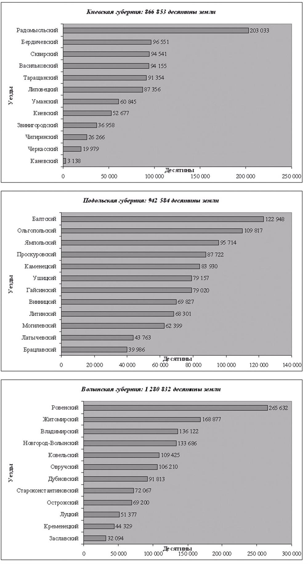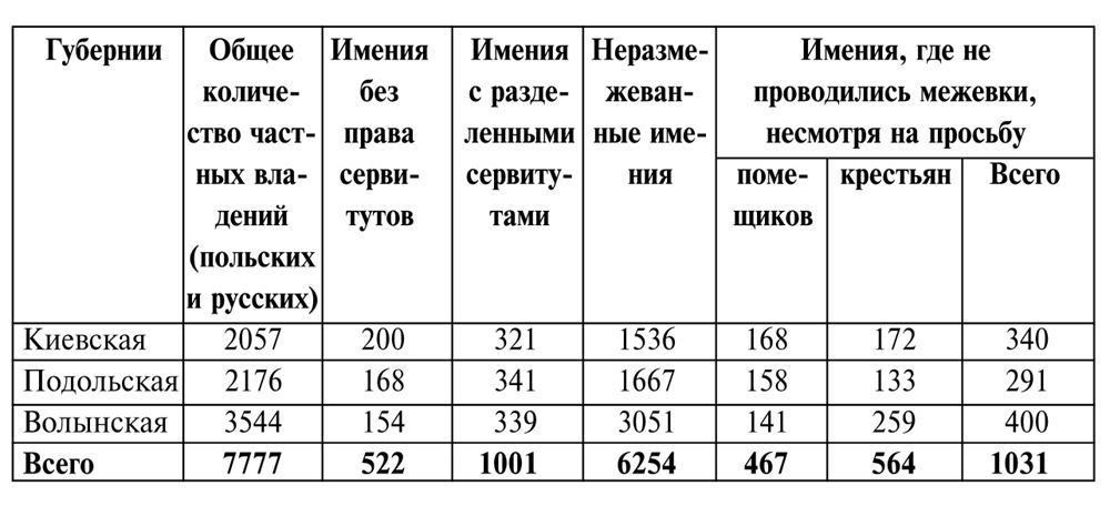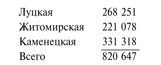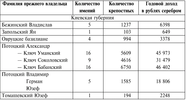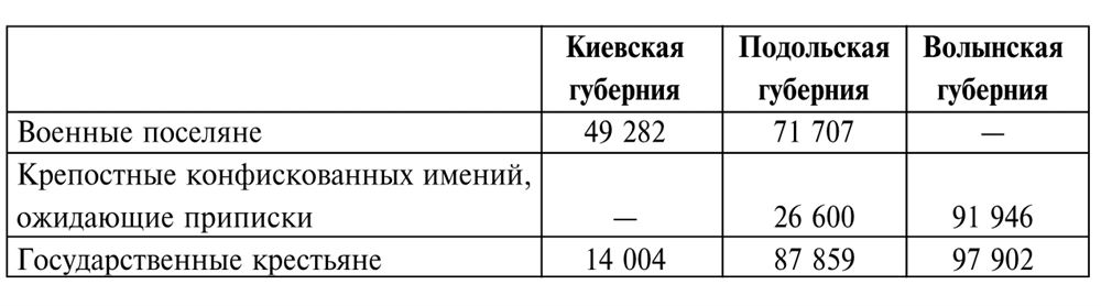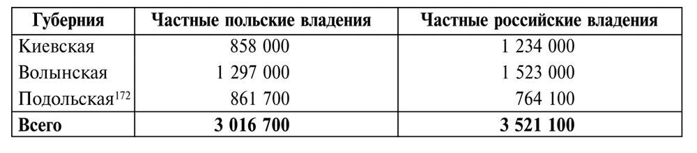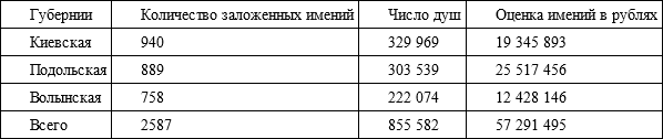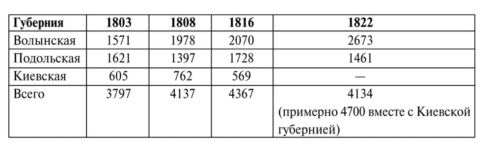 На протяжении последующих 25 лет в связи с интенсивным естественным приростом общее количество населения увеличилось почти на миллион. В дальнейшем мы увидим, что интересующая нас группа поляков составляла 7 – 8 % от общего числа основной массы населения, а именно – украинских крепостных и незначительной части государственных крестьян (последние остаются за рамками нашего анализа). Например, на Волыни в 1815 г. на 487 325 душ крепостных только мужского пола (единицей переписи была т.н. «ревизская душа») насчитывалось всего 12 186 казенных крестьян, зачастую нанимавшихся на работы к помещикам.