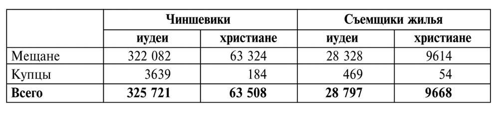 Количество евреев было несколько большее, чем поляков. Губернаторы крайне негативно высказывались об их численности в селах, особенно в период целой череды их переселений в города в конце 1807 г., последовавших за переписью еврейского населения на основании «Положения об устройстве евреев» от 9 декабря 1804 г. Эта переселенческая акция, рассчитанная на 1809 – 1810 гг., была приостановлена 29 декабря 1808 г., однако враждебное отношение к евреям со стороны поляков, русских и украинцев сохранилось. Хотя специальные правила и ограничения, более суровые по сравнению с предпринимаемыми в отношении поляков, казалось бы, сделали жизнь еврейской общины менее приметной, о ее присутствии следует постоянно помнить.