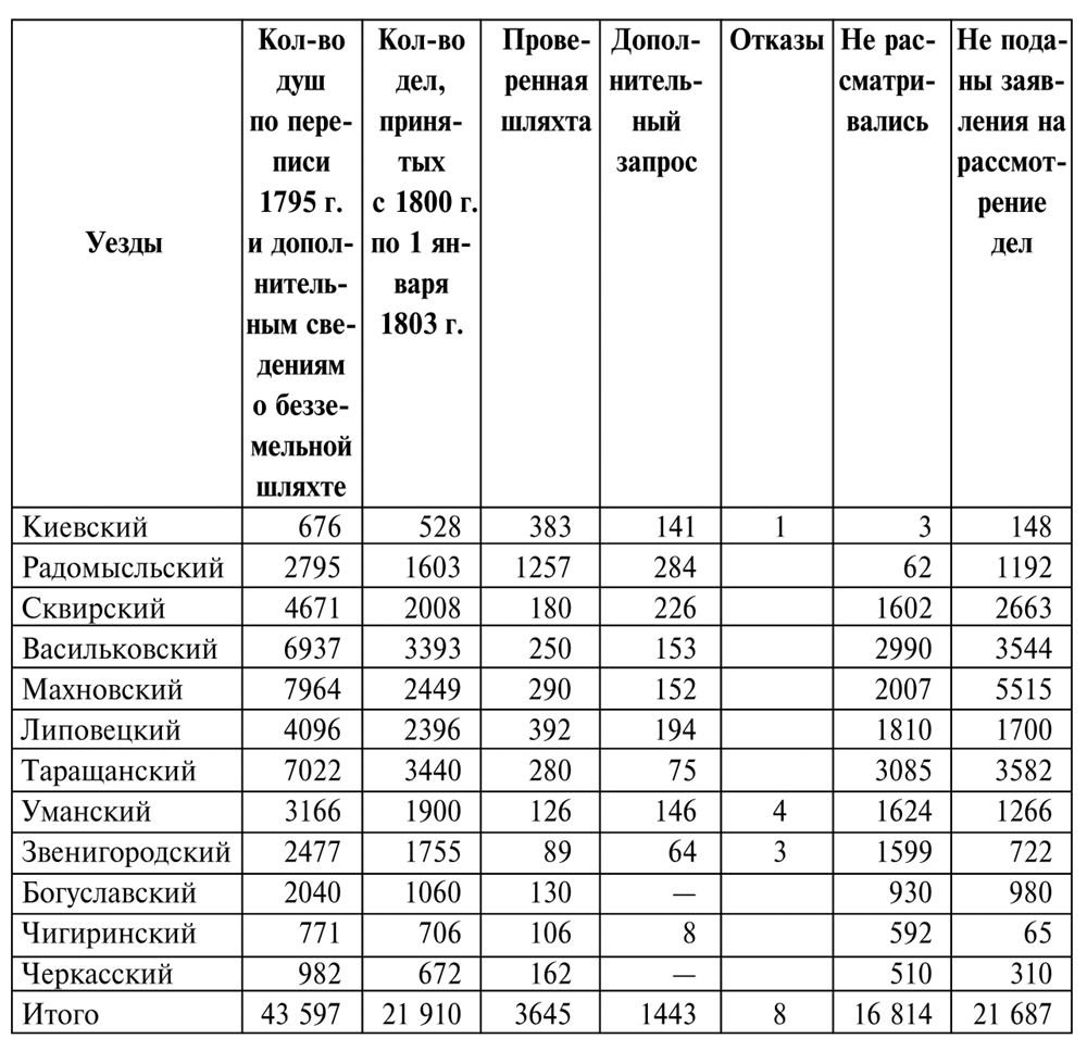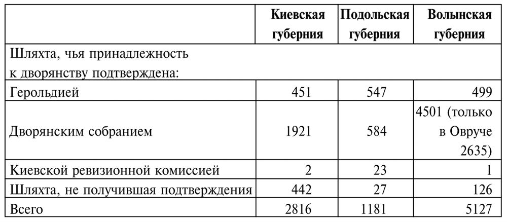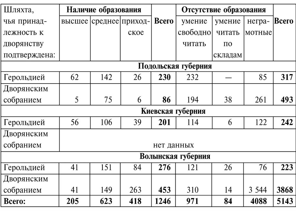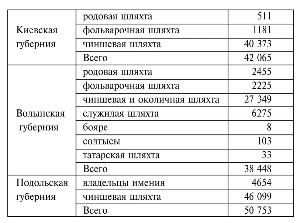 После публикации моих работ о польской шляхте на Украине в 1831 – 1863 и 1863 – 1914 гг. возникла необходимость расширения исследований23. Наибольшее недоумение и споры у специалистов вызывала крайне высокая численность шляхты на Правобережной Украине в XIX в., имевшей в большинстве своем (речь идет даже не о десятках, а о сотнях тысячах людей) крайне низкий социальный статус. Существование столь многочисленной группы безземельной шляхты было нехарактерно для социальной структуры Российской империи и стало одной из проблем, с которой царским властям так и не удалось справиться до 1917 г. Эта тема требовала отдельного исследования, которое бы позволило углубиться в историю и понять, каким образом эта проблема воспринималась и анализировалась хотя бы с того момента, как Правобережная Украина попала в сферу ответственности Петербурга, т.е. с 1793 – 1795 гг.