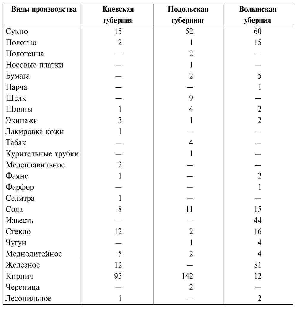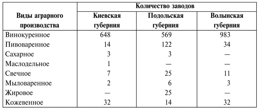 В ситуации неразвитости городов экономика практически полностью была ориентирована на сельское хозяйство, главным образом на производство зерновых – источник богатства местных помещиков. В среднем, в зависимости от года, каждая губерния Правобережной Украины производила от 3,5 до 4 млн четвертей зерна (мера объема сыпучих тел, равная 209,9 литра). Статистика не учитывала зерна, собранного крестьянами на своих наделах. Крепостным часто приходилось в обмен на барщину брать зерно у помещика. Традиционно зерно и лес чаще всего отправлялись в сторону Данцига или в австрийскую Галицию, хотя постепенно, вместе с развитием Одессы осваивалось черноморское направление. Во время Континентальной блокады получили развитие и ранее существовавшие в этом регионе винокуренное и пивоваренное производства. В 1807 г. на Киевщине насчитывалось в частных владениях 551 винокуренный завод и 11 пивоваренных. Разведением скота и коней занимались только в поместьях. Даже после 1850 г., в период оживления промышленного развития, эта часть Украины сохранила аграрный характер, а потому не стоит удивляться тому, что в интересующий нас период в «городах» было слабо развито ремесло. В зависимости от желания и инициативы помещиков существовали малочисленные стеклодувные, металлообрабатывающие, кирпичные, кожевенные, ткацкие мануфактуры, мастерские колесников, шляпные и др. производства.