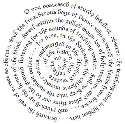 When the plastic fell away, Dante’s death mask stared up at him once again. The fragile plaster was still in its original Ziploc bag, having been retrieved as Langdon had requested from the lockers at the Venice train station. The mask appeared to be in flawless condition with one small exception — the addition of a poem, inscribed in an elegant spiral shape, on its reverse side.