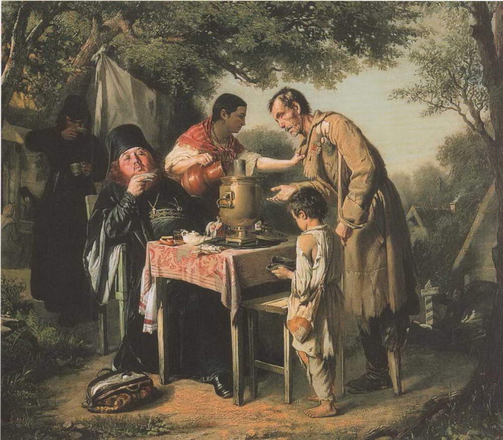 Перова совершенно не тронула и тем более не испугала цензурная реакция на неблаговидное изображение духовенства в Сельском крестном ходе, и в следующем году, незадолго до отъезда за границу, им была написана картина Чаепитие в Мытищах. Здесь снова в нелицеприятном свете выставлен толстый монах, с наигранным безразличием к окружающему предающийся ритуалу чаепития, в то время как слепой инвалид протягивает к нему руку за подаянием.