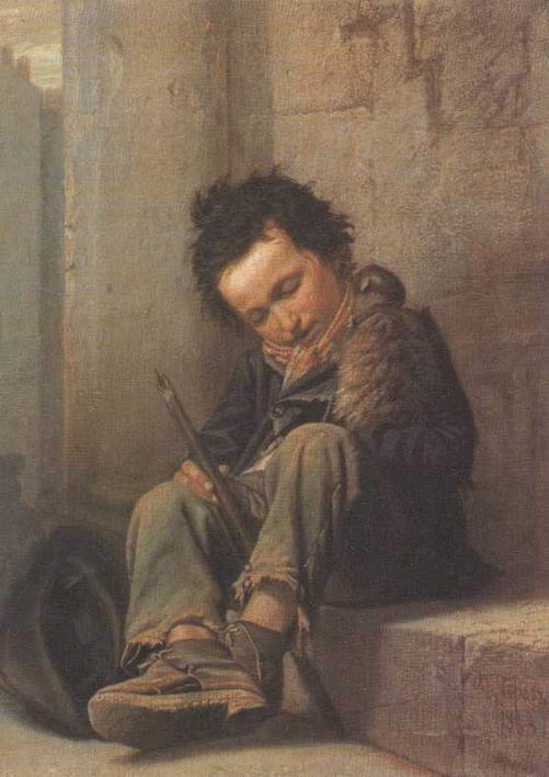 Самым знаменитым из этих этюдов стал Савояр - мальчик в рваной одежде и дырявых ботинках, заснувший прямо на парижской мостовой. К его плечу прильнула обезьянка, с которой савояр, видимо,дает представления, а у его ног лежит большая широкополая шляпа, в которую зрители кидают монеты.