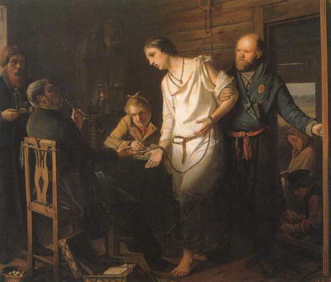 Картина изображает суд над деревенским парнем,скорее всего, порубщиком леса. Его только что ввели в избу, а писарь с подвязанной щекой уже записывает показания, но приговор ясен и так - мужичок у двери готовит розги, рядом пригорюнилась крестьянская девушка. Становому подносят водку и закуску, а у его стула стоит корзинка с яйцами - очевидно, подарок грозному судье, что должно характеризовать его как взяточника. Фигура провинившегося крестьянина в белоснежной, хотя и рваной рубахе, была написана с Иллариона Прянишникова, товарища Перова по Московскому училищу живописи. Эта фигура менее всего устраивала критиков - в ней усматривали сентиментальную идеализацию, находящуюся в противоречии с прозаизмом изображаемого житейского случая. Умоляющий жест подсудимого тем более трогателен, что его руки связаны тоненькой веревочкой,которую ничего не стоит разорвать, а староста держит его за локоть некрепко и даже как будто нежно, так что кротость юноши, не имеющего воли даже просто сделать энергичное движение, действительно провоцирует на благородное негодование по поводу «забитости» крестьянства и размышления на тему «ты проснешься ль, исполненный сил?» (Некрасов).