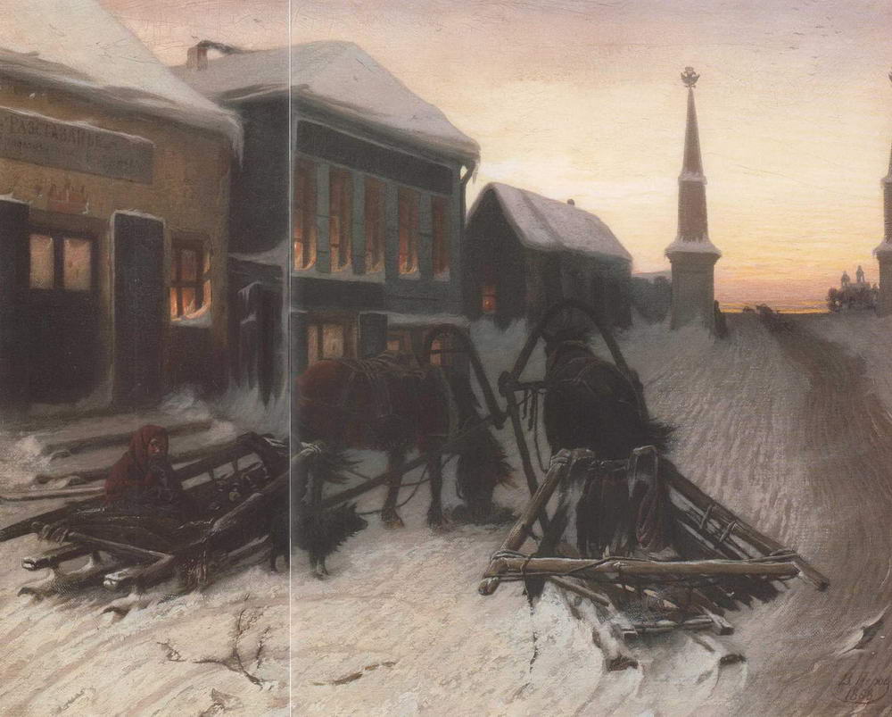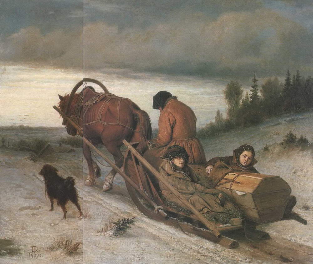 И действительно, картина могла бы служить идеальной заставкой поэмы. Но у Некрасова, где также описываются похороны бедного крестьянина, все же присутствует похоронный ритуал, проводы, шествие: