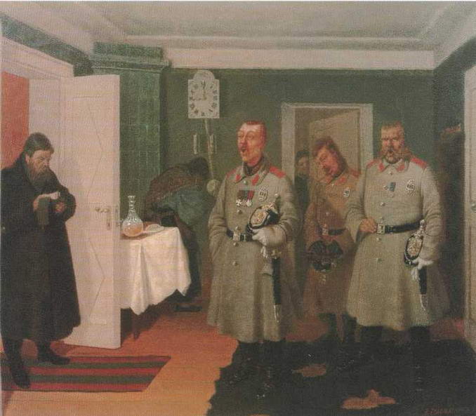 ...Пьяный священник раздавил ногой пасхальное яйцо, дьячок, потянувшийся «спасать» яичко,поскользнулся и упал, уронив молитвенник в грязь; крестьянка льет воду на голову одного пьянчужки, другой лежит под крыльцом. Остальные участники процессии тоже «не вполне» трезвы: женщина в спущенных чулках бредет, не разбирая дороги, за нею мужичок в дырявых лохмотьях и с развязанной онучей несет перевернутую икону.