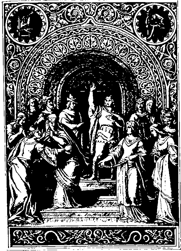 В саду, в тени деревьев, на белых коврах расположились воины Карла и забавлялись игрою в кости и шахматы. Сам же Карл сидел в своем массивном золотом кресле под сосной, около куста шиповника. В это время явились к нему послы короля Марсилия с масличными ветвями в руках и, сойдя с мулов, выказали ему всяческое почтение.