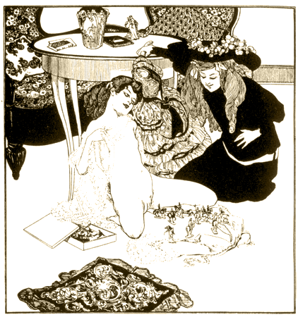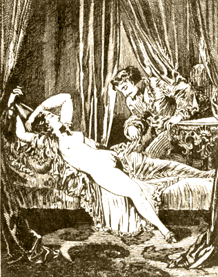 «Вскоре возгорелся спор, который еще больше увеличил наше радостное настроение. Спор зашел о том, у кого прекраснее чресла, у Ориаллис или у Миррины. Миррина скинула пояс, туника ее была совершенно прозрачна — она повернулась, и всем показалось, будто сквозь кристалл засияли прекрасные лилии. Она слегка дрогнула бедрами и сама улыбнулась красоте своих сладострастных форм. Потом начала, подобно Венере, принимающей должное ей поклонение, испускать сладостные стоны, которые до сих пор звучат еще в моих ушах. Но Ориаллис не сочла еще себя побежденной — она смело вышла на середину и сказала: „Я не состязаюсь в красоте под покрывалом. Я предстану, как на гимнастических упражнениях. Такие состязания не допускают одежды“. При этих словах она сбросила с себя тунику, осталась совершенно нагой и сказала прекрасной сопернице: „Посмотри, Миррина, на эту округлость бедер, на белизну и прозрачность этой кожи, посмотри на эти розовые лепестки, которые рука сладострастия набросила на их прекрасные очертания. При своей быстрой игре, при сладострастных судорогах они не дрожат слегка, как твои, о, Миррина, их движение подобно сладостному шелесту волн“. Ориаллис постепенно ускоряла это сладостное движение и показала такое искусство и такую красоту, что за ней единогласно была признана победа на состязании. После этого перешли к другим состязаниям: зашел спор о красоте живота, но никто из нас не решился состязаться с упругим, прекрасным и гладким животом Филумены. Вся ночь прошла в этих развлечениях, и мы закончили ее негодованием нашим любовникам и мольбой Венере, чтобы она посылала нам каждый день нового поклонника, потому что новизна — самая обольстительная прелесть любви. И все мы были опьянены восхищением, когда расстались».