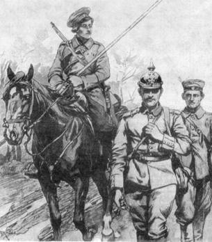 Конвоирование казаком немецких солдата и офицера, плененных под Гумбиненом. Август 1914 г.