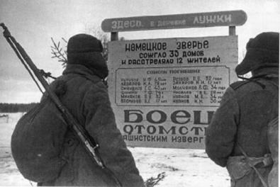 Советские солдаты перед плакатом о зверствах фашистских захватчиков. 1943 г.