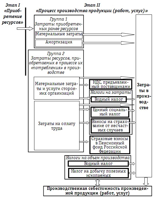 Финансовый результат хозяйственной деятельности рассчитывается только на этапе III деятельности предприятия в процессе сопоставления показателей доходов и расходов, возникших при проведении операций продажи, которые можно называть доходными операциями. Однако налоговые обязательства возникают у предприятия не только на этапе III и соответственно учитываются при исчислении прибыли/убытка, но и как результат хозяйственных операций этапов I и II (см. схему 1), например, приобретение активов длительного пользования – основных средств, в том числе транспортных средств и/или земельных участков, приводит к возникновению обязательств по налогу на имущество организаций, транспортному и земельному налогам. Потребление в процессе производства таких ресурсов, как труд, приводит к появлению налоговых обязательств по единому социальному налогу и взносам на обязательное социальное страхование, а использование водных ресурсов – к обязательствам по водному налогу и т. д. Появившиеся на этапе приобретения ресурсов и этапе производства налоговые обязательства накапливаются на счете 68 (69) в сумме с налоговыми обязательствами, возникшими в процессе продажи продукции (работ, услуг). Однако некоторые налоговые обязательства, возникшие на этапах I и II деятельности предприятия, относятся в момент их начисления не на счета финансовых результатов, а включаются в состав иных показателей, формируемых в бухгалтерском учете, например в состав затрат, возникших в процессе производства и образующих показатель производственной себестоимости произведенной продукции. Это означает, что налоги, включенные в состав затрат и соответственно в состав себестоимости, будут участвовать в расчете финансового результата предприятия позже – в момент продажи продукции. Однако при исчислении налоговой нагрузки предприятию важно, что данные налоговые обязательства уже возникли и были включены в общую сумму налоговых обязательств на счетах 68 и 69.