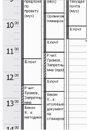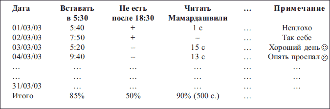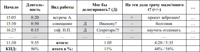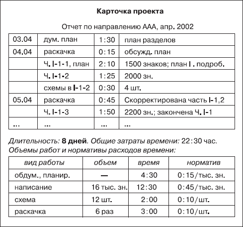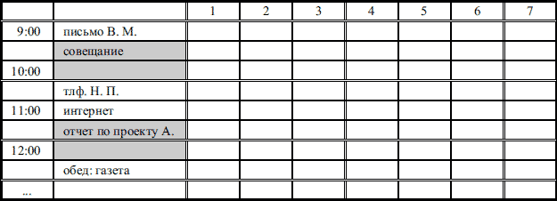 …Мне кажется, что у нас в России идея организации времени не привьется. Представить себе не могу русского человека, который фиксирует по часам и записывает в таблицу события дня с целью… да с любой целью не могу представить! А уж связать время и деньги так и подавно невозможно! Это не вяжется в русской голове.