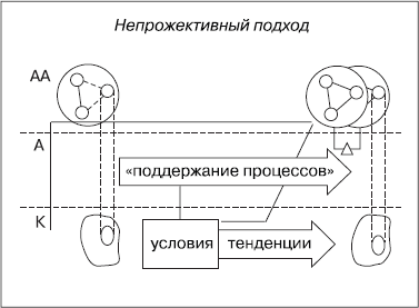 Прожективный ("платонический")/непрожективный подходы к организации деятельности. В прожективном подходе делается акцент на исполнение некоторого разработанного до осуществления деятельности проекта, на "подгонке" деятельности под этот проект; в непрожективном — на отслеживании естественных закономерностей развития деятельности, присоединении к тенденциям ее развития, гибком реагировании на представляющиеся возможности. Прожективный подход наиболее уместен в задачных ситуациях и в ситуациях организации более или менее косных, малоподвижных объектов; непрожективный — в проблемных ситуациях и в ситуациях борьбы, неопределенности, высокой непредсказуемости среды.