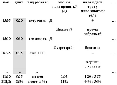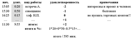Второй, несколько более сложный способ учета – фиксация времени начала дела и его продолжительности. К нему стоит переходить, когда выработалась устойчивая привычка записывать все расходы времени в течение дня. Пример такого учета: