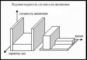 До сих пор мы говорили о «сплошной» аналитике, сложность которой изменялась только с течением времени. На рисунке эта ситуация изображена левой группой фигур: две кратких по времени и сложных по аналитике «дисциплинарных недели», время между которыми заполнено более простой аналитикой. При этом аналитика «накрывает» все дела, независимо от их характера.