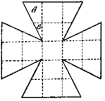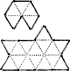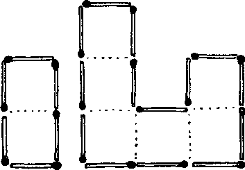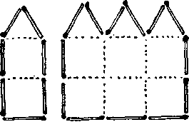 487. На рисунке показано, как можно ограничить две фигуры 7 и 13 спичками соответственно, чтобы при этом площадь одной из них была ровно в 3 раза больше площади другой. Пунктирные линии показывают, что одна фигура составлена из 2 квадратов и равностороннего треугольника, а другая — из 6 таких же квадратов и 3 треугольников. Двенадцать горизонтальных и вертикальных спичек остались на месте.