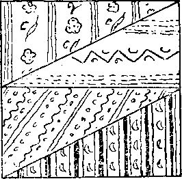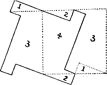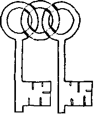 515. Сначала вырежьте одним куском ключи и кольцо, как показано на рисунке. Теперь надрежьте картон в полтолщины вдоль восьми маленьких черных линий и аналогичным образом надрежьте картон с противоположной стороны вдоль пунктирных линий. Затем просуньте перочинный нож под каждый из четырех маленьких квадратов, образованных этими линиями, и три куска отделятся друг от друга так. что ключи окажутся свободно висящими на кольце.