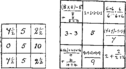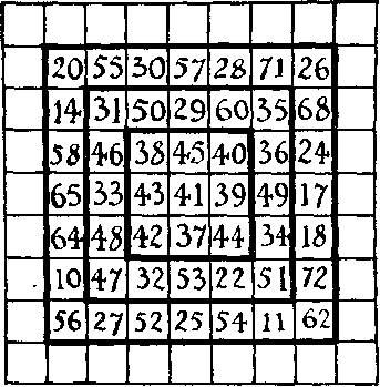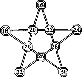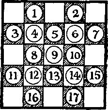 470. На рисунке показано правильное решение: два квадрата, составленные из пустышек, находятся внутри. Если бы в приведенном ранее примере не все числа находились на границе, то нужно было бы просто поменять местами отсутствующее число и пустышки. Так что в этом случае не было бы никакой головоломки. Однако, поскольку все числа присутствовали на границе, таким простым маневром обойтись не удалось.
