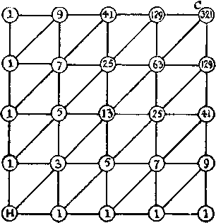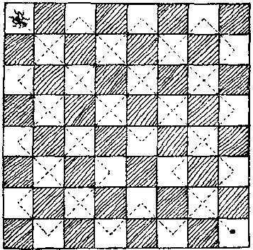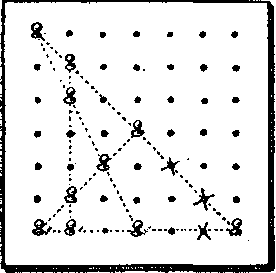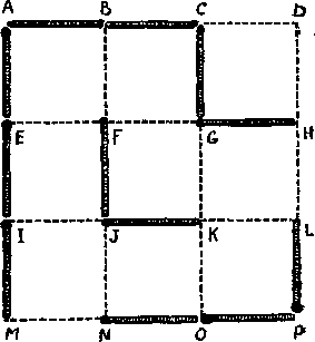 463. Мне следует пойти на MN. Мой противник может пойти на HL, тогда я отвечу ходом на CD. (Если бы он пошел на CD, то я ответил бы HL, и позиции оказались бы одинаковыми.) Самое лучшее, что он может теперь сделать, это пойти на DH (выиграв одно очко), но, поскольку он вынужден снова ходить, я выигрываю оставшиеся восемь квадратов.
