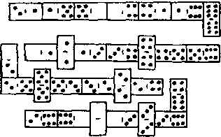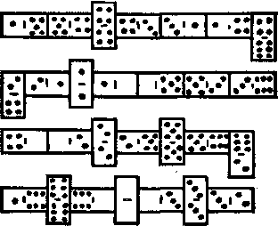 473. Если мы уберем из комплекта четыре костяшки 7—6, 5—4, 3—2, 1—0, то из оставшихся костяшек можно будет составить правильную последовательность. Подойдут также любые другие комбинации этих чисел; мы могли бы, например, убрать 7—0, 6—1, 5—2 и 4—3. Общее правило состоит в том, что из комплекта домино, заканчивающегося дублем нечетного числа, мы должны убрать костяшки, которые содержат в совокупности все числа от пустышки до числа, на две единицы меньшего самого большого числа в нашем наборе.