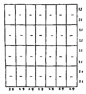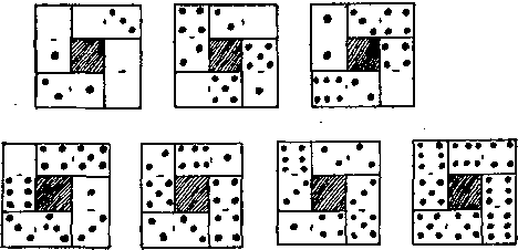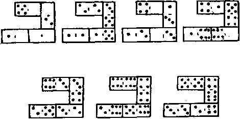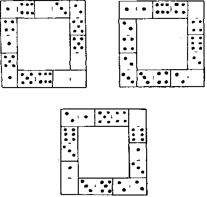 472. На рисунке показано, как можно сложить из 28 костяшек 7 полых квадратов, чтобы при этом суммы очков вдоль каждой из сторон в любом квадрате равнялись между собой. При составлении квадратов вам полезно иметь в виду следующее маленькое правило. Если сумма очков равна, скажем, 7 (как в первом примере), а вы хотите, чтобы их сумма вдоль каждой из сторон равнялась 3, то 4 × 3 - 7 дает нам 5 — сумму очков в четырех углах. Это совершенно необходимо. Так, в последнем примере 4 × 16 = 64 - 43 говорит нам о том, что сумма очков, стоящих по углам, должна равняться 21: так оно и есть в действительности.
