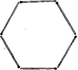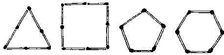 479. Наименьшее возможное число равно 36 спичкам. Мы можем составить треугольник и квадрат из 12 и 24 спичек, треугольник и пятиугольник — из 6 и 30 спичек, треугольник и шестиугольник — из 6 и 30 спичек, квадрат и пятиугольник — из 16 и 20 спичек, квадрат и шестиугольник — из 12 и 24 спичек, а пятиугольник и шестиугольник — из 30 и 6 спичек. Эти пары чисел можно варьировать во всех случаях, за исключением четвертого и последнего. Общее число спичек не может быть меньше 36. Для треугольника и шестиугольника нужно взять число спичек, делящееся на 3; на квадрат и шестиугольник идет четное число спичек. Следовательно, искомое число должно находиться среди чисел, делящихся на 6, таких, как 12, 18, 24, 30, 36. но меньше чем из 36 спичек нельзя сложить пятиугольник и шестиугольник.