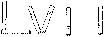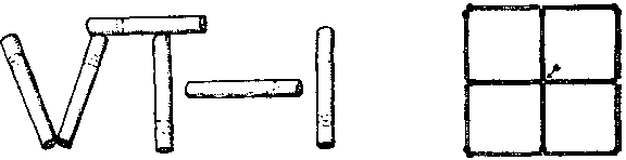 484. Передвиньте две сигареты, образующие букву L, и поместите их так, как показано на рисунке. Мы имеем корень квадратный из 1 минус 1 (то есть 1—1), что равно, очевидно, 0. Во втором случае мы можем сдвинуть те же сигареты, поместив одну из них рядом с V, а другую рядом со второй I так, чтобы получилось слово NIL (ничто).
