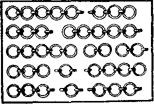 Самое лучшее, что мы можем сделать, это освободить все 10 звеньев в трех кусках и с их помощью соединить оставшиеся 10 кусков, затратив 30 центов. В качестве таких кусков можно взять 1 кусок из 4 звеньев и 2 куска по 3 звена. Так, если мы включим в число 3 кусок из 3 звеньев и 1 кусок из 4 звеньев, расположенные в среднем ряду, то получим всего 5 больших и 5 маленьких звеньев.