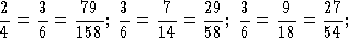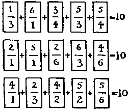 465. На рисунке показано, как следует расположить костяшки, домино, чтобы сумма в каждой из строк равнялась 10. Приведите все дроби к общему знаменателю 60. Тогда сумма всех числителей должна равняться 1800, или по 600 в каждой строке, чтобы получилось 10. Выбор и расположение костяшек требуют небольшого размышления и изобретательности.