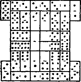 471. Решение приведено на рисунке. Сумма всех очков равна 132. Одна треть ее равна 44. Разделите сначала все костяшки на три кучки, по 44 очка в каждой. Затем если мы попытаемся взять сумму очков вдоль стороны, равной 12, то, поскольку 4 раза по 12 на 4 превышает 44, мы должны добиться в каждом случае того, чтобы сумма очков, стоящих по четырем углам, в каждой рамке равнялась 4. Остальное получается после ряда проб, причем можно менять местами костяшки из разных кучек, содержащие равное число очков.