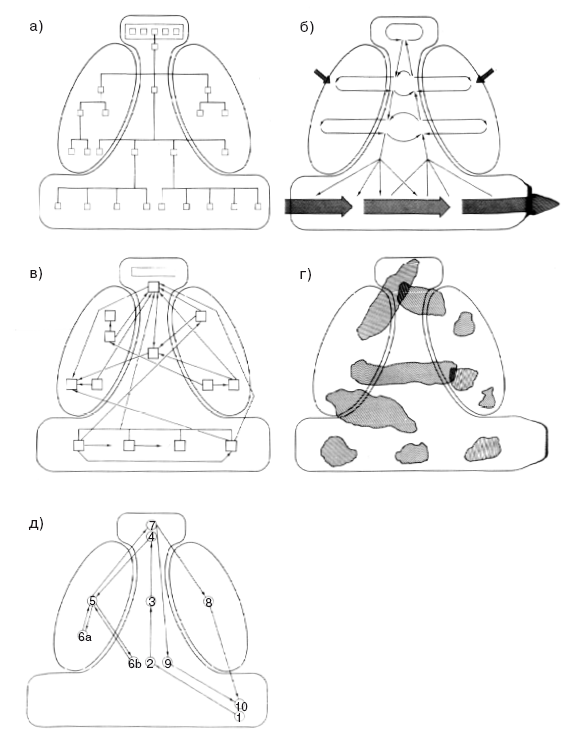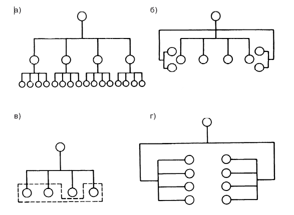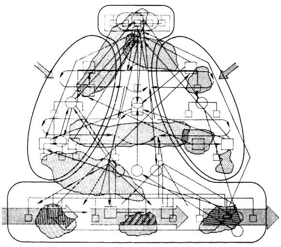 Структура должна быть спроектирована таким образом, чтобы организация владела и управляла системами рабочих потоков и сама задавала взаимосвязи между своими частями. Эти потоки и взаимосвязи нельзя однозначно назвать линейными по форме (когда один элемент следует строго за другим). А вот слова как раз линейны. Поэтому иногда очень трудно дать словесное описание структурированию организации. Слова необходимо подкреплять изображениями. В этой книге мы будем часто ссылаться на диаграммы. Для того чтобы представить саму организацию, нам необходима всего одна базовая диаграмма – та, которую можно по-разному обыгрывать, показывая, что может происходить в организациях и какие формы они могут принимать.