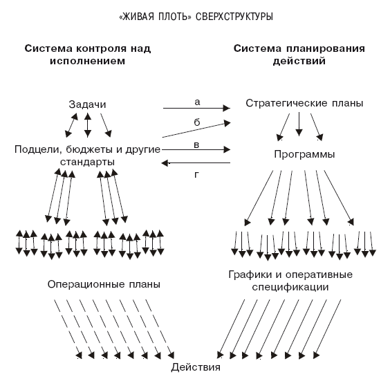 В этот же контекст следует поместить и слово «аппарат», «штаб» (staff). В ранних работах по теории организации оно использовалось в противовес линейным полномочиям (line); в принципе, только линейные менеджеры обладают формальным правом принимать решения и отдавать распоряжения. Сотрудники же аппарата дают рекомендации линейным менеджерам и участвуют в принятии решений, но не имеют права непосредственно отдавать приказы вне сферы своих компетенций. Далее мы увидим, что разграничение между линейными менеджерами и аппаратом в одних структурах сохраняется (во всяком случае, что касается аналитического, но не вспомогательного персонала), а в других нет. Тем не менее для нас разграничение между линейными полномочиями и штабными небесполезно, и мы будем пользоваться этими терминами, хотя и придавая им несколько иной смысл. К аппарату мы будем относить техноструктуру и вспомогательный персонал, то есть группы, изображенные по обе стороны «ствола» на тематической диаграмме, а к линейным менеджерам – центральную часть диаграммы, то есть управленцев, наделенных формальными полномочиями, позволяющими им выступать посредниками между стратегической вершиной и операционным ядром. Напомним, что в данном случае не учитывается право принимать решения или только советовать. Как мы увидим, вспомогательный персонал обычно не дает рекомендаций; у него совершенно особые функции, в отношении которых принимаются особые решения, только косвенно связанные с функциями операционного ядра. Директор заводской столовой может быть вовлечен в общий производственный процесс, но он не имеет ничего общего с основным производством. Равным образом право техноструктуры давать рекомендации иногда перетекает в право принимать решения, но лишь вне потока контролирующих операционное ядро формальных полномочий.[10]