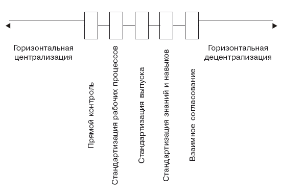Пять координационных механизмов в основном раскрывают способы, посредством которых организации координируют свою деятельность: взаимное согласование, прямой контроль, стандартизация рабочих процессов, стандартизация выпуска и стандартизация навыков и знаний (квалификации). Рассмотрим вкратце каждый из них.