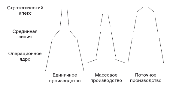 На нашем логотипе небольшой стратегический апекс соединяется расширяющейся книзу срединной линией с большим, широким операционным ядром. Очертив эти три части организации одной непрерывной линией, мы показываем, что обычно они связаны между собой единой цепочкой формальных властных полномочий. Расположение техноструктуры и вспомогательного персонала по обе стороны «ствола» подчеркивает, что они отделены от главной линии власти и оказывают на операционное ядро лишь косвенное влияние.